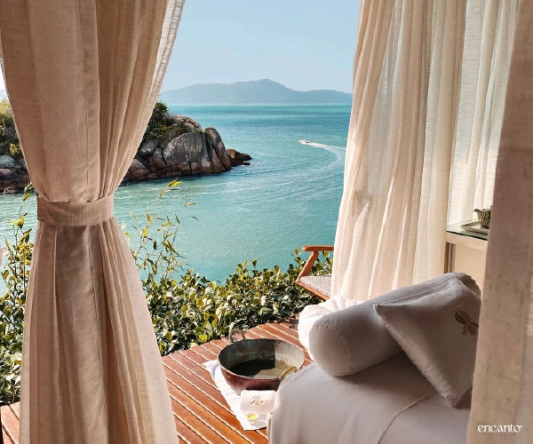 Entre rochedos, água esmeralda e vegetação exuberante, o Awasi desenha uma experiência de quietude absoluta. Suas vilas privadas com hidromassagem, aulas de yoga, spa e vistas contemplativas convidam a um verdadeiro recolhimento. Aqui, a calm-cation ganha intensidade serena: uma pausa profunda, envolta em privacidade e conforto.