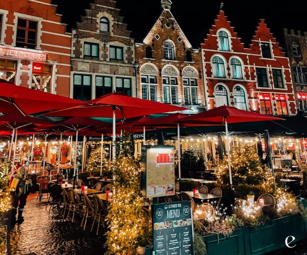 Bruges com suas ruas de pedra e prédios históricos iluminados, convidam a uma caminhada para perceber que o cenário peculiar faz parte de uma experiência natalina autêntica. Na temporada, a atmosfera tranquila e acolhedora contrasta com o frio, e o Natal toma forma nas conversas em cafés e restaurantes, bebidas quentes, pequenas lojas e vitrines cheias de detalhes encantadores.