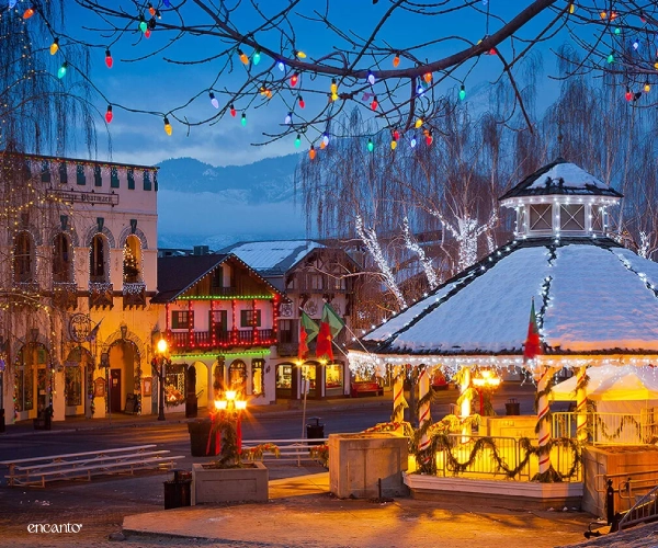 Leavenworth é uma vila bávara no interior dos Estados Unidos, aos pés das montanhas, onde a arquitetura alpina, as luzes e a programação de Natal com corais, apresentações ao vivo e o famoso festival de iluminação, constroem um cenário que abraça a atmosfera natalina. No inverno, a neve cobre telhados e ruas, as fachadas ganham decoração caprichada, e cervejarias, chocolaterias e pequenas lojas intensificam o clima acolhedor.